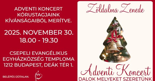 November 30. Vasárnap 18:00-19:30 Ádventi Koncert Zöldalma Zenede (ingyenes)